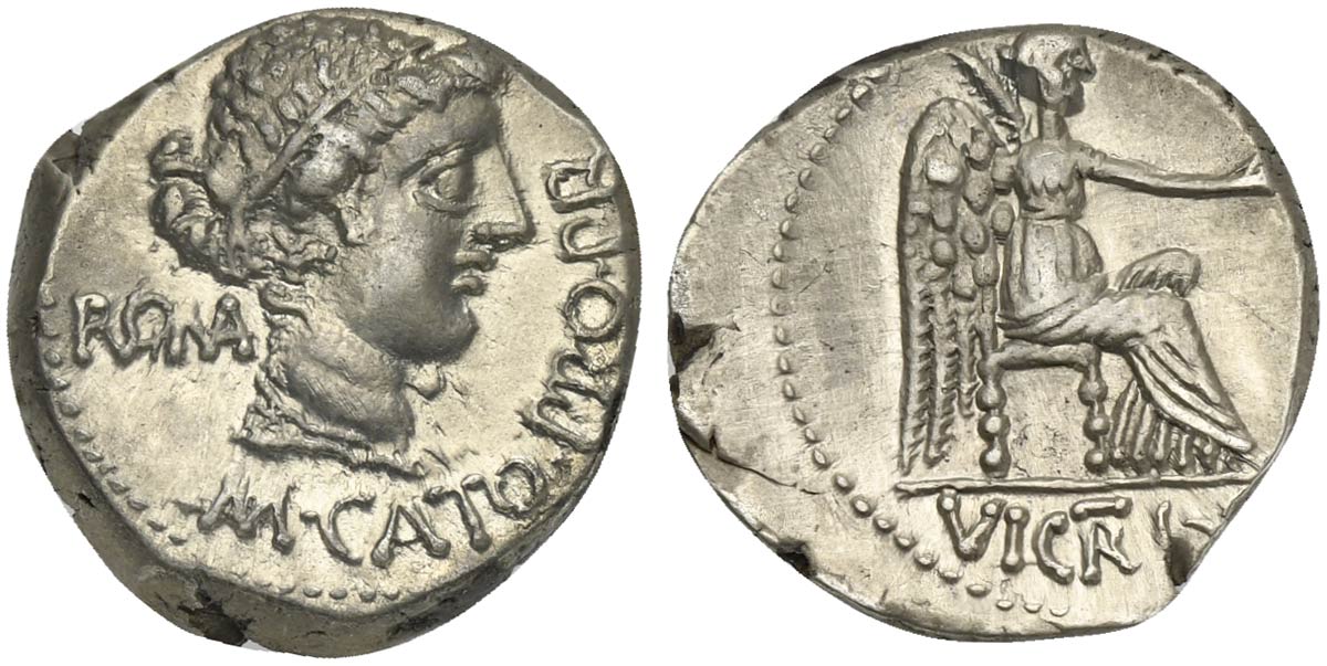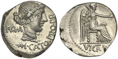 M. Porcius Cato, Denarius, Utica, Spring 47- Spring 46 BC. AR (g 4,05; mm 17; h 9). Draped female bust (Roma or Libertas?) r.; RO(MA) behind, M•CATO•PRO•PR before, Rv. Victory seated r., holding patera and palm frond over shoulder; VIC(TR)IX below. Crawford 462/1a; Porcia 10; Sydenham 1053. Good very fine