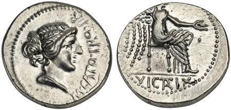 M. Porcius Cato, Denarius, Utica, Spring 47- Spring 46 BC. AR (g 4,08; mm 18; h 11). Draped female bust r.; M•CATO•PRO•PR before, Rv. Victory seated r., holding patera; VIC(TR)IX in exergue. Crawford 462/1c; Porcia 9; Sydenham 105
