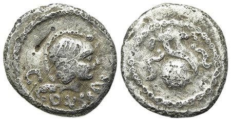 C. Considius Paetus, Sestertius, Rome, 46 BC. AR (g 1,01; mm 11; h 1). Winged bust of Cupid r.; C CONSIDI; Rv. Double cornucopia set on globe. Crawford 465/8a; Considia 10; Sydenham 997a. Rare, fine