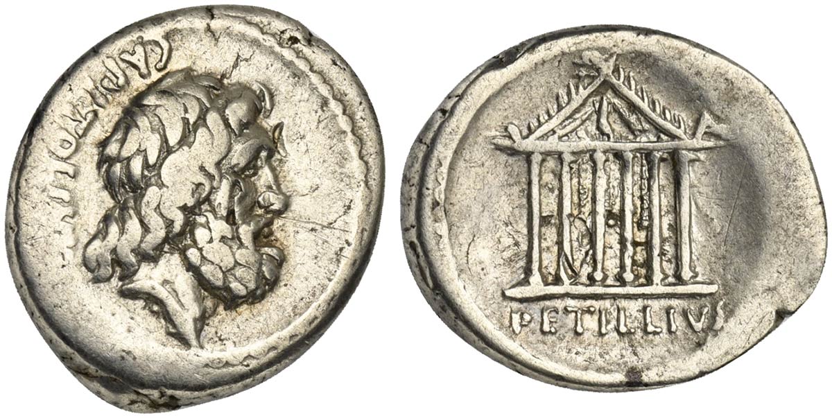 Petillius Capitolinus, Denarius, Rome, 41 BC. AR (g 3,90; mm 19; h 1). Bare head of bearded Jupiter r.; CAPITOLINVS behind, Rv. The Capitoline Temple of Jupiter: decorated hexastyle façade with ornamented pediment and garlands han