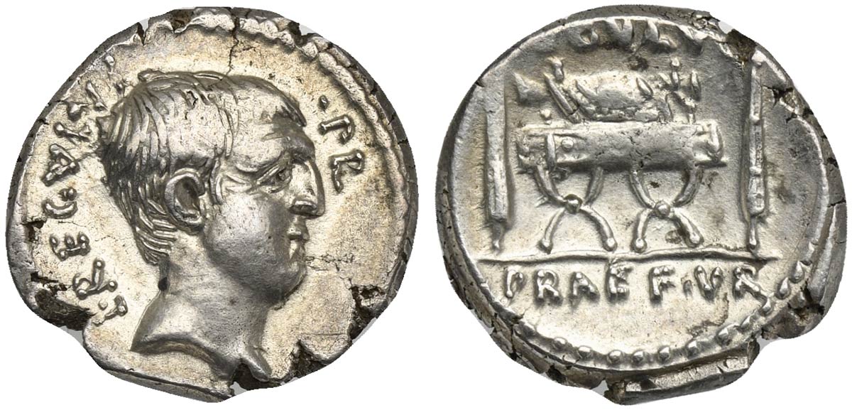 L. Livineius Regulus, Denarius, Rome, 42 BC. AR (g 3,98; mm 18; h 11)Bare head of the praetor L. Livineius Regulus r.; REGVLVS behind, PR before, Rv. Curule chair between two fasces; [R]EGVLV[S•F] above, PRAEF•VR in exergue. Crawf