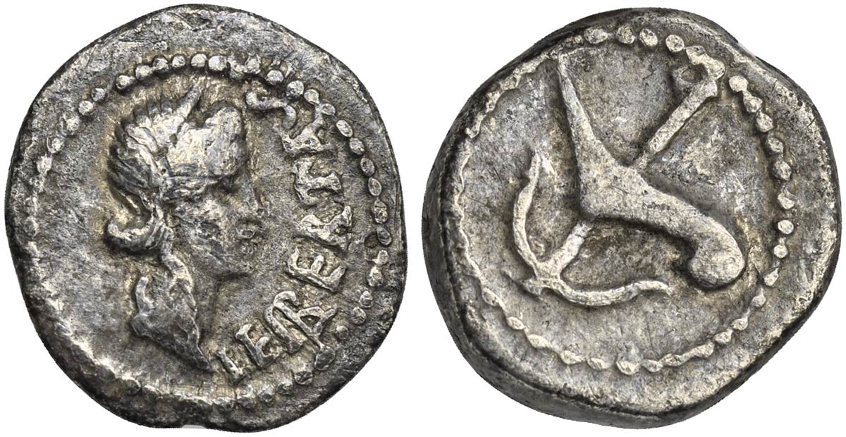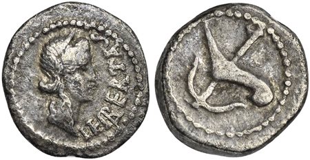 Brutus, Quinarius, military mint traveling with Brutus and Cassius in western Asia Minor or northern Greece, Spring-early summer 42 BC. AR (g 1,76; mm 14; h 4). Diademed head of Libertas r.; LEIBERTAS before, Rv. Stem of prow and anchor in saltire. Crawford 506/3; RSC 5a; Sydenham 1288. Very fine