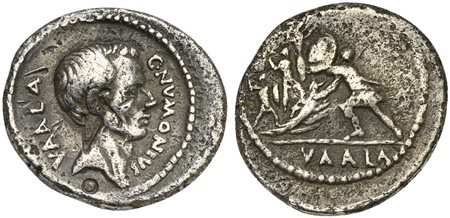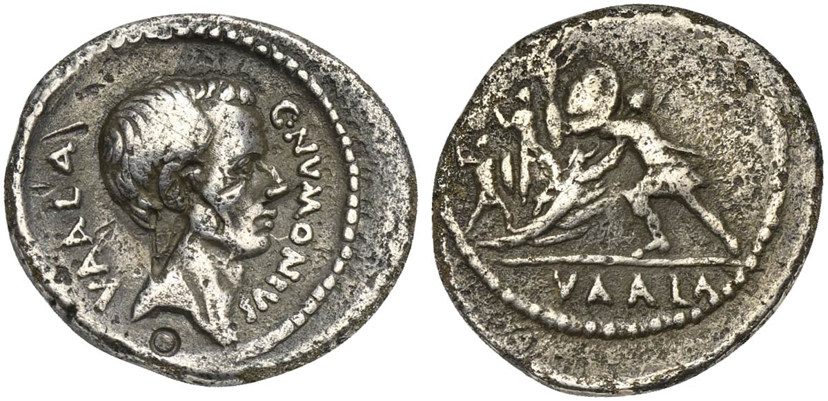 C. Numonius Vaala, Denarius, Rome, 41 BC. AR (g 3,59; mm 20; h 1). Bare head of Numonius Vaala r.; C•NVMONIVS before, VAALA behind, Rv. A warrior l., armed with a shield and a sword attacking a vallum, which is defended by two sol