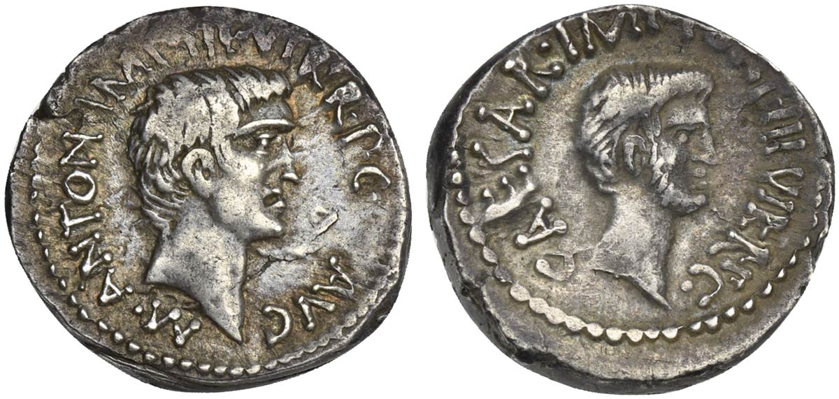 Mark Antony and Octavian, Denarius, Military mint traveling with Antony in Syria(?), Autumn 41 BC. AR (g 3,63; mm 19; h 1). Bare head of Mark Antony r.; M•ANTON•IMP•III•VIR•R•P•C•AVG around, Rv. Bare head of Octavian r., with slight beard; CAESAR•IMP•PONT•III•VIR•R•P•C around. Crawford 528/3; RSC 2; Sydenham 1194. Good very fine