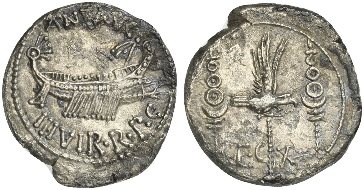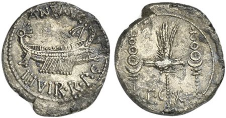 Mark Antony, Denarius, Patrae(?), Autumn 32-spring 31 BC. AR (g 3,16; mm 18; h 6). Praetorian galley r.; ANT•AVG above, III•VIR•R•P•C below, Rv. Legionary aquila r. between two standards; LEG X. Crawford 544/24; RSC 38; Sydenham 1228. Very fine