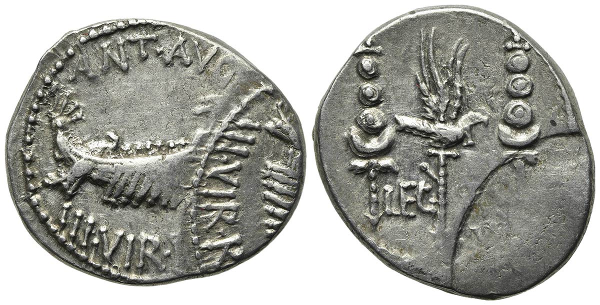 Mark Antony, Denarius, Patrae(?), Autumn 32-spring 31 BC. AR (g 3,76; mm 18,5; h 3; mm 18; h 6). Galley r.; ANT•AVG above, III•VIR•[R•P•C] below, Rv. LEG [...], legionary aquila between two signa. Crawford 544. Die-shft, good very