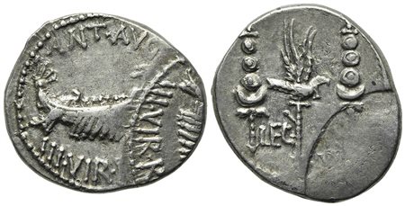 Mark Antony, Denarius, Patrae(?), Autumn 32-spring 31 BC. AR (g 3,76; mm 18,5; h 3; mm 18; h 6). Galley r.; ANT•AVG above, III•VIR•[R•P•C] below, Rv. LEG [...], legionary aquila between two signa. Crawford 544. Die-shft, good very fine
