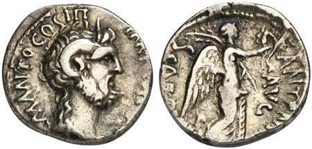 Mark Antony, Denarius, Cyrene, L. Pinarius Scarpus, imperator, Summer 31 BC. AR (g 3,52; mm 19; h 12). Head of Jupiter Ammon r.; M•ANTO•COS•M•IMP around, Rv. Victory advancing r., holding palm frond and extending wreath; SCARPV•IMP to l., ANTONI[O] AVG to r. Crawford 546/2d; RSC 1b; Sydenham 1280. Very fine