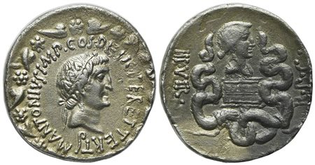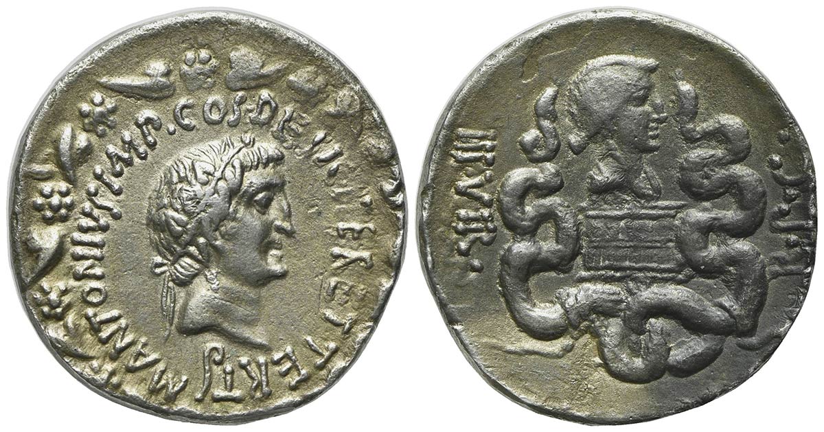 Mark Antony and Octavia, Cistophoric Tetradrachm, Ionia: Ephesus; Summner-autumn 39 BC. AR (g 10,52; mm 26; h 12). Head of Antony r., wearing ivy wreath; lituus below; all within wreath of ivy and flowers, Rv. Draped bust of Octavia r. above cista mystica, flanked by interlaced serpents with heads erect. RPC I 2201; CRI 262; Sydenham 1197; RSC 2.