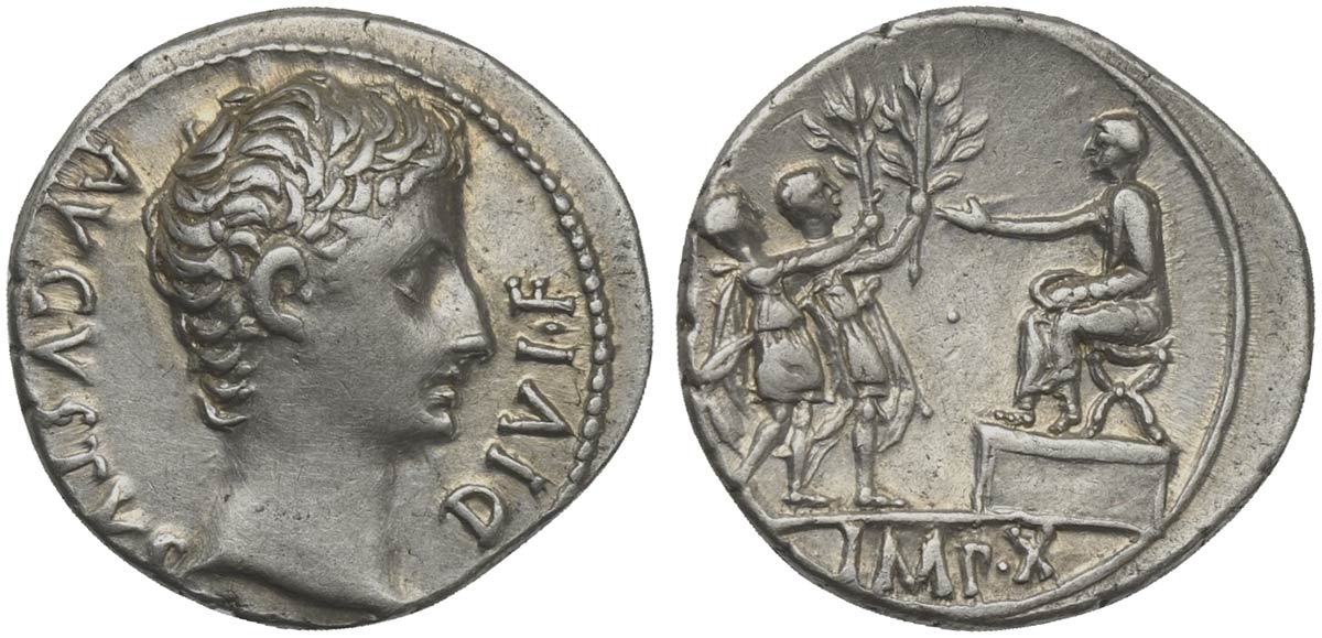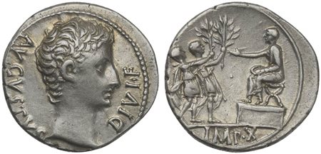 Augustus (27 BC-AD 14), Denarius, Lugdunum, 15 BC. AR (g 3,77; mm 19; h 6). AVGVSTVS DIVI F, Bare head r., Rv. Augustus seated l. on curule chair set on daïs, extending hand toward two soldiers, each carrying parazonium and presenting laurel branches; IMP•X in exergue. RIC 165a; RSC 133. Toned, good very fine - near extremely fine