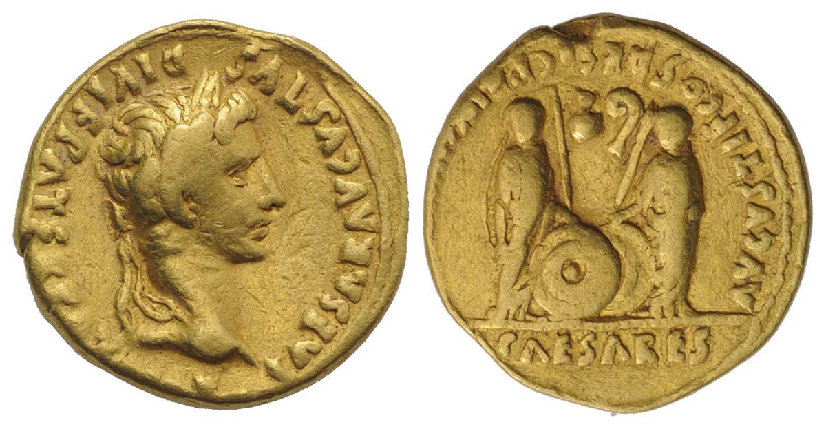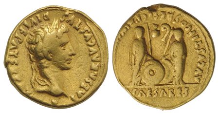 Augustus (27 BC-AD 14). AV Aureus (g 7.72, mm 20, h 3). Lugdunum, 2 BC-AD 4. CAESAR AVGVSTVS DIVI F PATER PATRIAE, Laureate head r.; Rv. CL CAESARES AVGVSTI F COS DESIG PRINC IVVENT, Caius and Lucius Caesars standing facing, two s