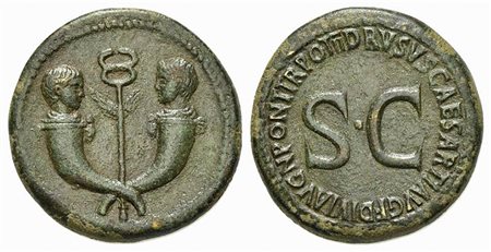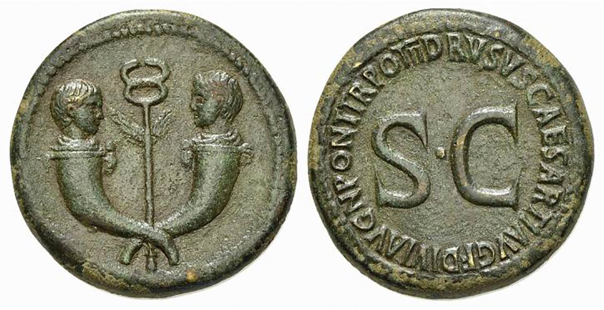 Tiberius and Germanicus Gemellus (19-37/8 and 19-23/4, respectively), Sestertius, Rome, 22-3. AE (g 26,56; mm 35; h 12). Crossed cornucopias, each surmounted by head of boy; winged caduceus between; Rv. DRVSVS CAESAR TI AVG F DIVI