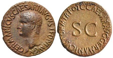 Germanicus (died AD 19), As, Rome, AD 37-8. AE (10.18 g, mm 28, h 7). GERMANICVS CAESAR TI AVGVST F DIVI AVG N, Bare head l.; Rv. C CAESAR AVG GERMANICVS PON M TR POT, Legend around large S·C. RIC 35 (Gaius). Near very fine