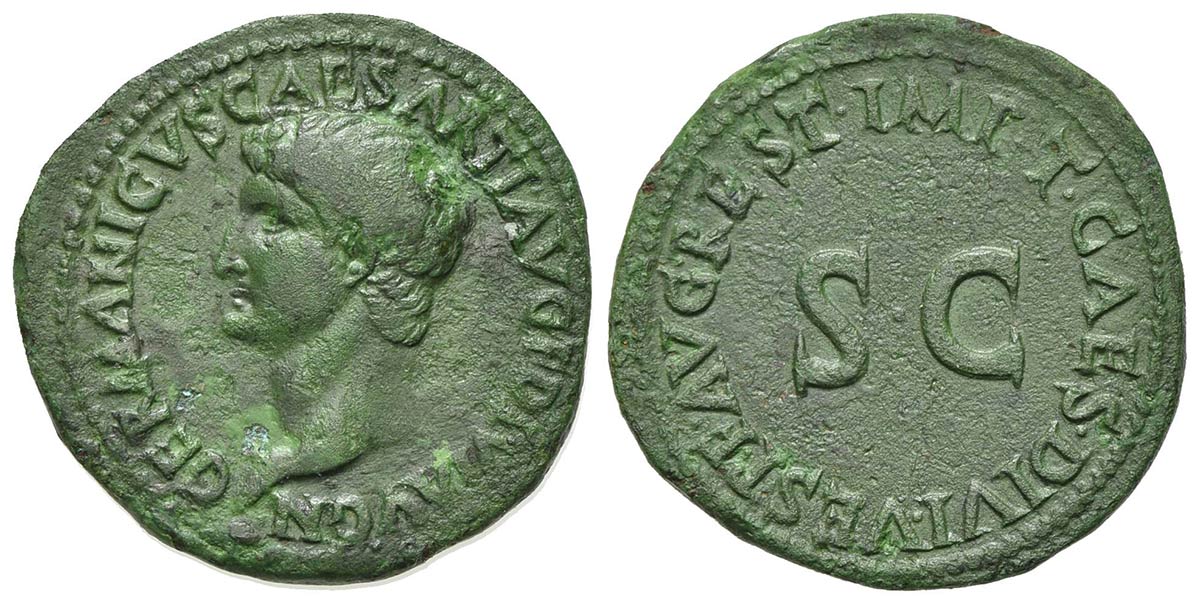 Germanicus (died AD 19), As, Rome, Restitution issue struck under Titus, AD 80-1. AE (g 9.36; mm 27; h 7). GERMANICVS CAESAR TI AVG F DIVI AVG N, bare head l.; Rv. IMP T CAES DIVI VESP F AVG REST, legend around SC. RIC 442 (Titus). Green patina, good very fine