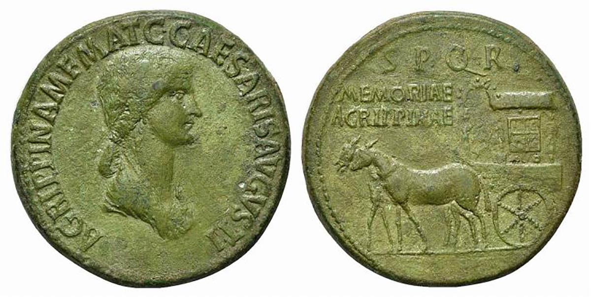 Agrippina Senior (died AD 33), Sestertius, Rome, AD 37-41. AE (g 25,58; mm 34,5; h 6). AGRIPPINA M F MAT C CAESARIS AVGVSTI, Draped bust r., hair in long plait; Rv. SPQR MEMORIAE AGRIPPINA, Two mules drawing ornamented carpentum l