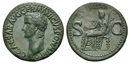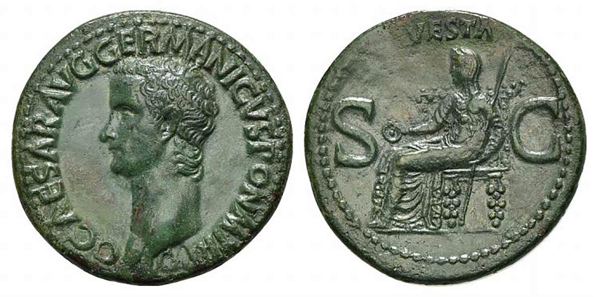 Gaius (Caligula, 37-41), As, Rome, AD 37-8. AE (g 10,14; mm 29; h 6). C CAESAR AVG GERMANICVS PON M TR POT, Bare head l.; Rv. VESTA, Vesta seated l. on ornamental throne, holding patera and sceptre. RIC 38. Green patina, smoothed, good very fine