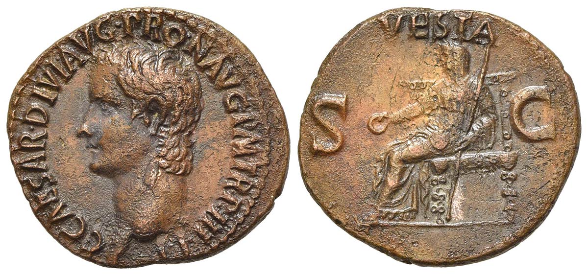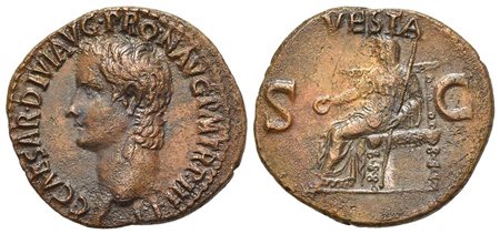 Gaius (Caligula, 37-41), As, Rome, 40-1. AE (8.81 g, mm 29, h 6). C CAESAR DIVI AVG PRON AVG P M TR P IIII P P, Bare head l.; Rv. VESTA, Vesta seated l. on ornamental throne, holding patera and sceptre. RIC 54. Very fine