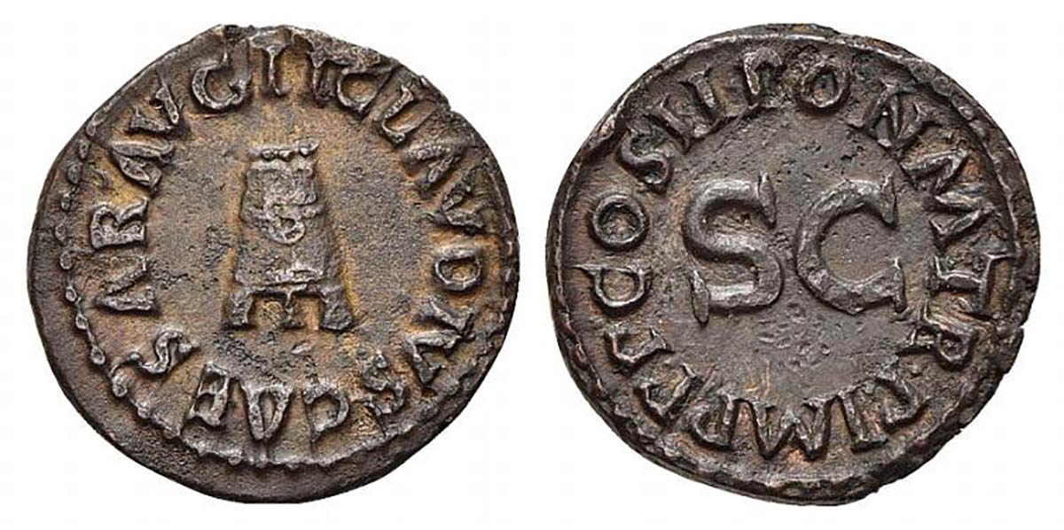 Claudius (41-54), Quadrans, Rome, AD 41. AE (g 2,81; mm 18; h 1). TI CLAVDIVS CAESAR AVG, Three-legged modius; Rv. TR P IMP P P COS II PON M, Legend around large S • C. RIC 90. Good very fine