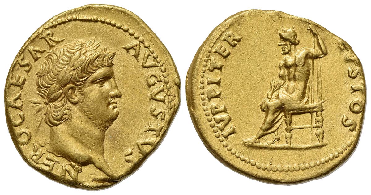 Nero (54-68), Aureus, Rome, c. 64-5. AV (g 7,32; mm 18,5; h 7). NERO CAESAR AVGVSTVS, Laureate head r.; Rv. IVPPITER CVSTOS, Jupiter seated l., holding sceptre and thunderbolt. RIC 52; Calicó 412. Extremely fine
