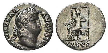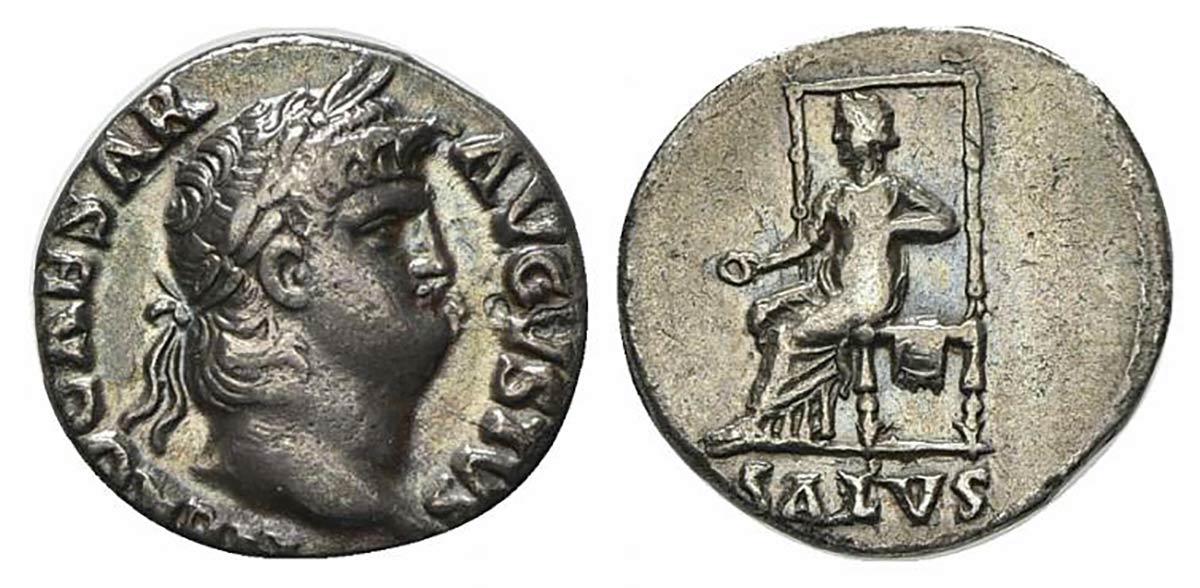 Nero (54-68), Denarius, Rome, c. 65-6. AR (g 3,33; mm 16,5; h 6). IMP NERO CAESAR AVGVSTVS, Laureate head r.; Rv. SALVS,Salus seated l. on ornamented throne, holding patera. RIC I 60; RSC 314. Very fine