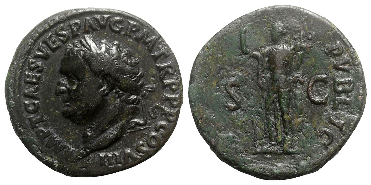Titus (79-81), Sestertius, Rome, 80-1. AE (g 26,33; mm 34; h 7). IMP T CAES VESP AVG P M TR P P P COS VIII, Laureate head l.; Rv. [FELICITAS] PVBLICA, Felicitas standing l., holding sceptre and cornucopia. RIC 144. Dark green pati