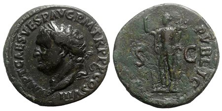 Titus (79-81), Sestertius, Rome, 80-1. AE (g 26,33; mm 34; h 7). IMP T CAES VESP AVG P M TR P P P COS VIII, Laureate head l.; Rv. [FELICITAS] PVBLICA, Felicitas standing l., holding sceptre and cornucopia. RIC 144. Dark green pati