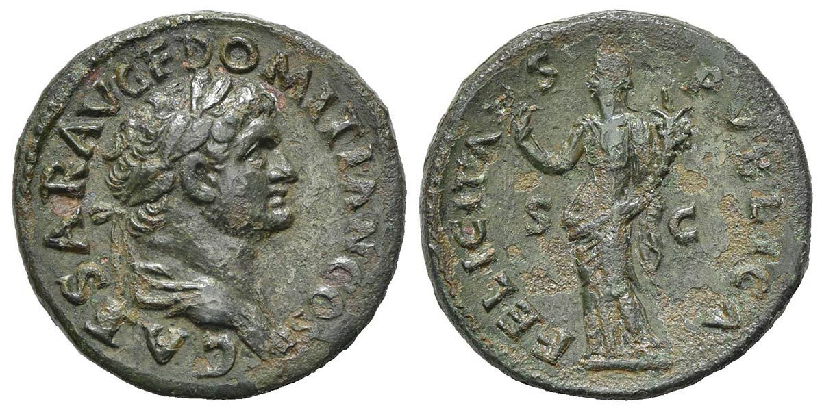 Domitian (Caesar, 69-81), Dupondius, Rome, 73-4. AE (g 12.23; mm 27; h 6). CAESAR AVG F DOMITIAN COS II, Laureate and draped bust r.; Rv. FELICITAS PVBLICA, Felicitas standing l., holding caduceus and cornucopia. RIC 658 (Vespasia