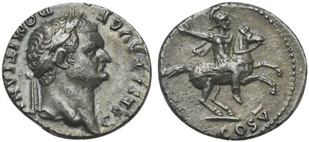 Domitian (Caesar, 69-81), Denarius, Rome, 77-8. AR (g 2,98; mm 18; h 5). CAESAR AVG F DOMITIAN[VS], Laureate head r., Rv. Soldier on horseback rearing r., raising r. hand; COS V below. RIC 957 (Vespasian); RSC 49a. Toned, good very fine