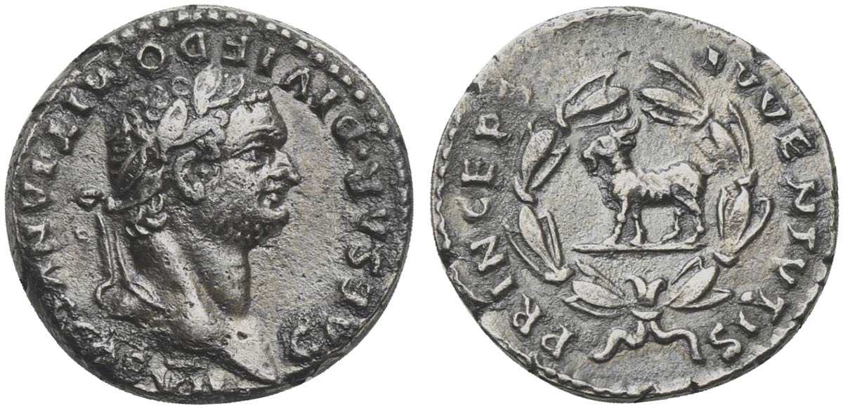 Domitian (Caesar, 69-81), Denarius, Rome, 80-1. AR (g 3,09; mm 17; h 5). CAESAR DIVI F DOMITIANVS COS VII, Laureate head r., Rv. PRINCEPS IVVENTVTIS, Goat standing l. within laurel wreath. RIC 267 (Titus); RSC 390. Very fine / good very fine