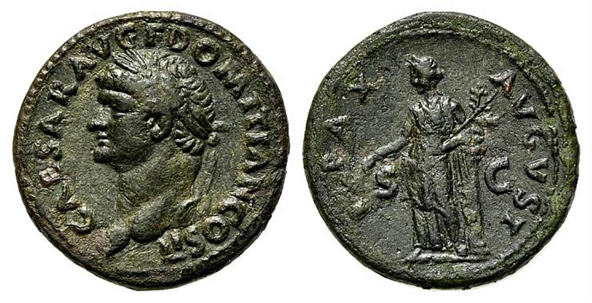 Domitian (Caesar, 69-81), As, Rome, AD 73. AE (g 10,94; mm 28; h 6). CAESAR AVG F DOMITIAN COS II, Laureate head l.; Rv. PAX AVGVST, Pax standing l., holding winged caduceus and branch, leaning on cippus, S - C. RIC 670 (Vespasian). Very fine