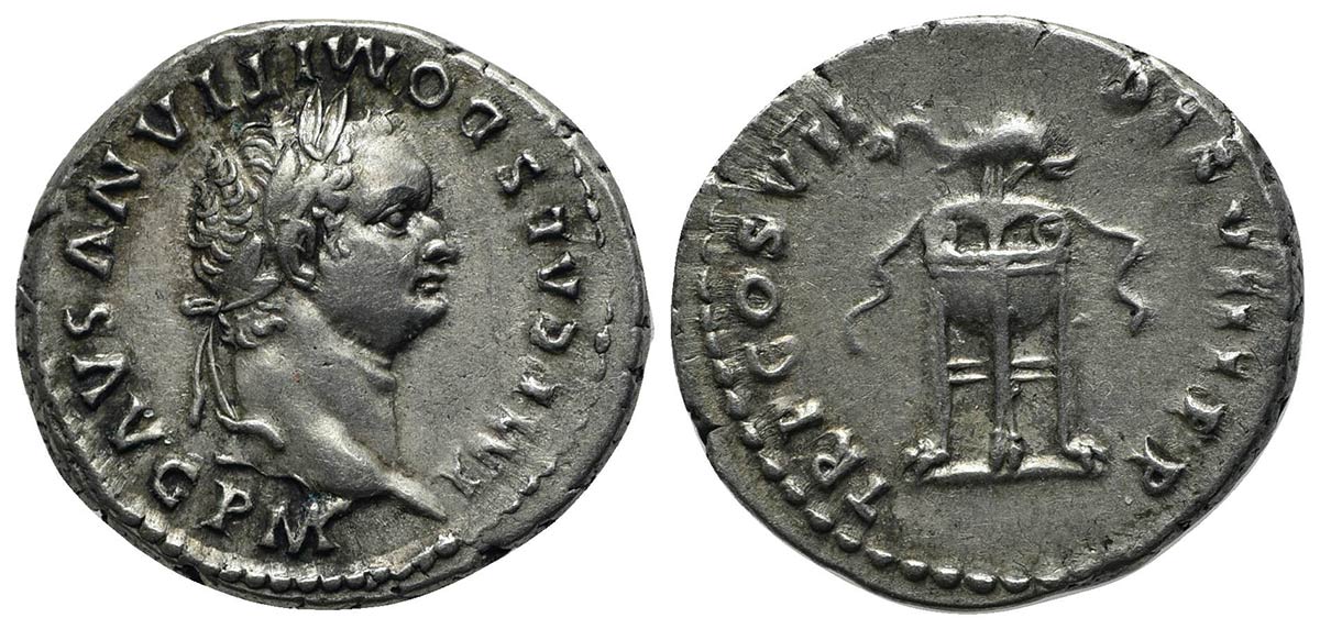 Domitian (81-96), Denarius, Rome, AD 81. AR (g 3,56; mm 19; h 6). IMP CAES DOMITIANVS AVG P M, Laureate head r.; Rv. TR P COS VII DES VIII P P, Dolphin r. above filleted tripod. RIC 74; RSC 568c. Near extremely fine
