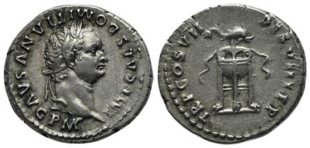 Domitian (81-96), Denarius, Rome, AD 81. AR (g 3,56; mm 19; h 6). IMP CAES DOMITIANVS AVG P M, Laureate head r.; Rv. TR P COS VII DES VIII P P, Dolphin r. above filleted tripod. RIC 74; RSC 568c. Near extremely fine