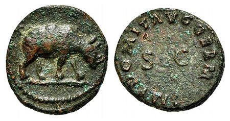 Domitian (81-96), Quadrans, Rome, 84-5. AE (g 1,99; mm 14; h 8). IMP DOMIT AVG GERM around large SC; Rv. Rhinoceros advancing r. RIC 249. Green patina, very fine