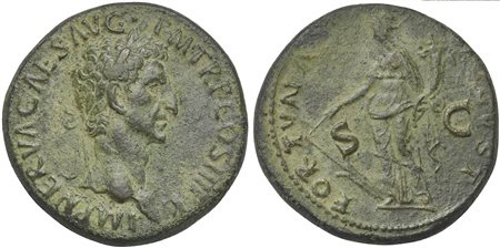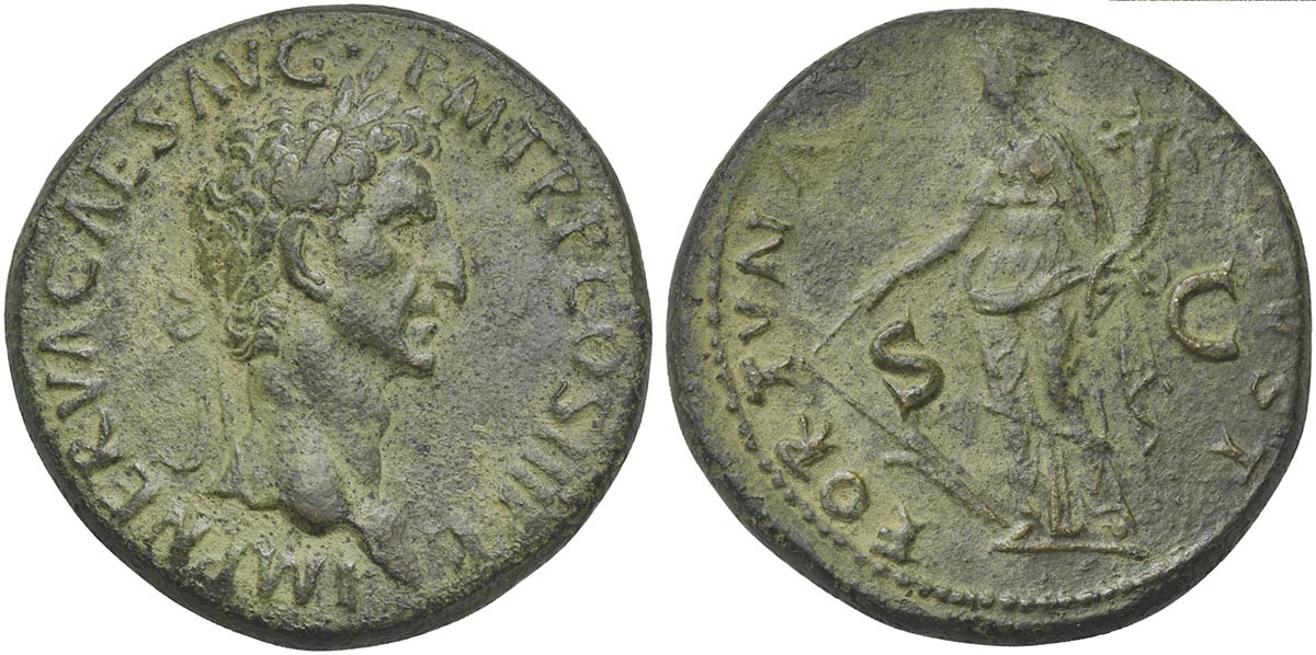 Nerva (96-98), Sestertius, Rome, AD 97. AE (g 20,76; mm 32; h 6). IMP NERVA CAES AVG P M TR P COS III P P, Laureate head r., Rv. FORTVNA AVGVST, Fortuna standing l., holding rudder and cornucopia, S - C. RIC 83. Green patina, very fine - good very fine