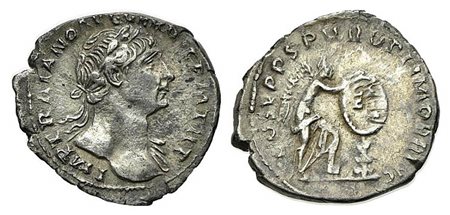 Trajan (98-117), Denarius, Rome, AD 111. AR (g 2,97; mm 18; h 6). IMP TRAIANO AVG GER DAC P M TR P, Laureate bust r., slight drapery; Rv. COS V P P S P Q R OPTIMO PRINC, Victory standing r., foot on step, inscribing shield set on palm tree. RIC 130; RSC 80. Very fine