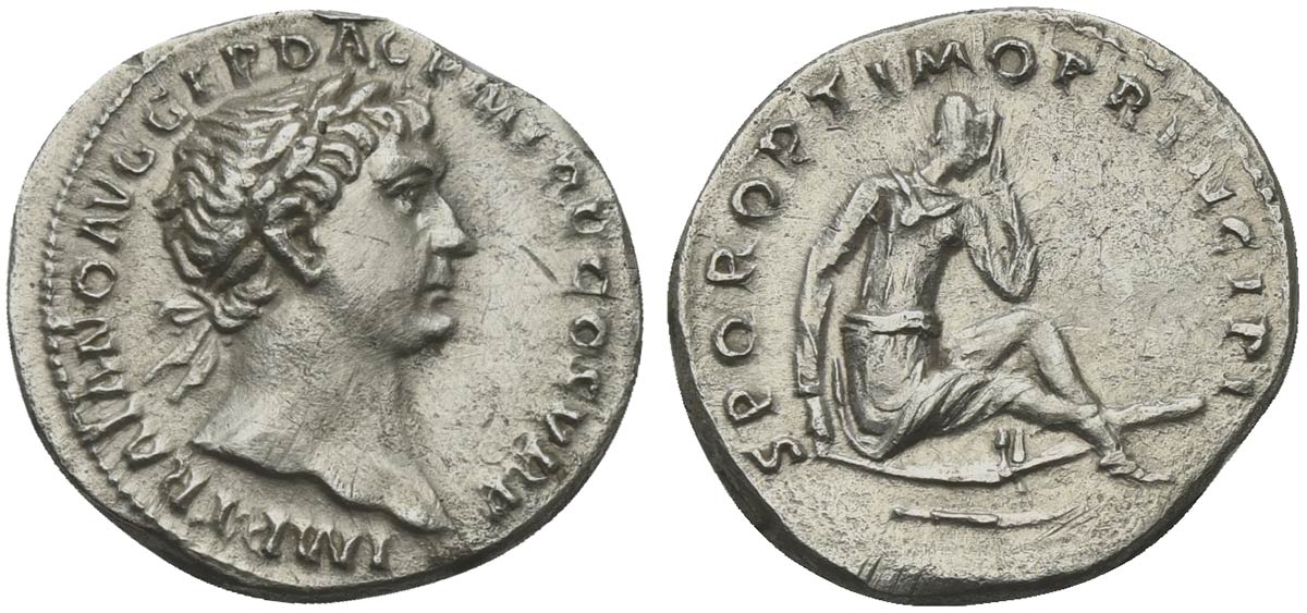 Trajan (98-117), Denarius, Rome, 103-107. AR (g 3,19; mm 18; h 6). IMP TRAIANO AVG GER DAC P M TR P COS V P P, Laureate bust r., Rv. S P Q R OPTIMO PRINCIPI, Dacian seated r. on shield in attitude of mourning; curved sword below.