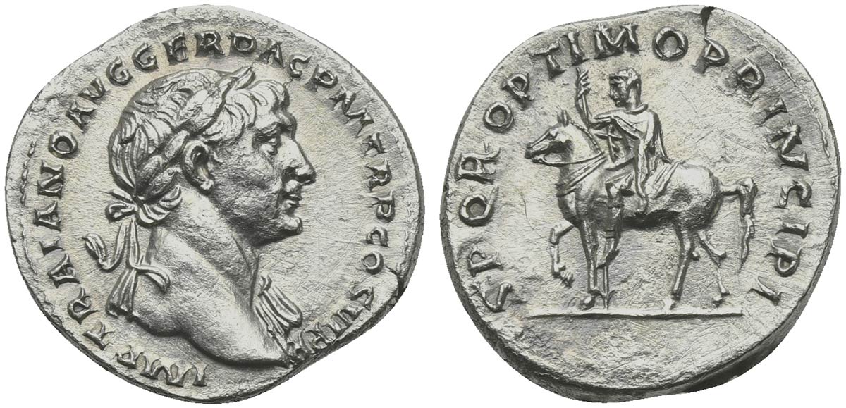 Trajan (98-117), Denarius, Rome, ca. 112-3. AR (g 3,25; mm 19; h 7). IMP TRAIANO AVG GER DAC P M TR P COS VI P P, Laureate bust r., slight drapery, Rv. S P Q R OPTIMO PRINCIPI, Trajan on horseback l., holding spear. RIC 291 var. (bust type); RSC 497a. Near extremely fine