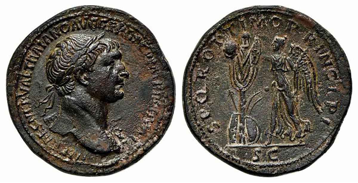 Trajan (98-117), Sestertius, Rome, ca. 106-107. AE (g 26,73; mm 35; h 6). IMP CAES NERVAE TRAIANO AVG GER DAC P M TR P COS V P P, Laureate bust r., slight drapery; Rv. SPQR OPTIMO PRINICIPI, Victory standing l., holding palm frond