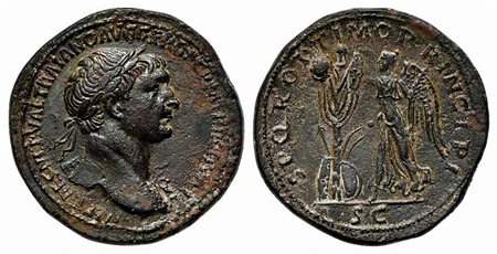 Trajan (98-117), Sestertius, Rome, ca. 106-107. AE (g 26,73; mm 35; h 6). IMP CAES NERVAE TRAIANO AVG GER DAC P M TR P COS V P P, Laureate bust r., slight drapery; Rv. SPQR OPTIMO PRINICIPI, Victory standing l., holding palm frond and erecting a trophy; hexagonal and round shields at base, S - C. RIC 523. Brown patina, very fine