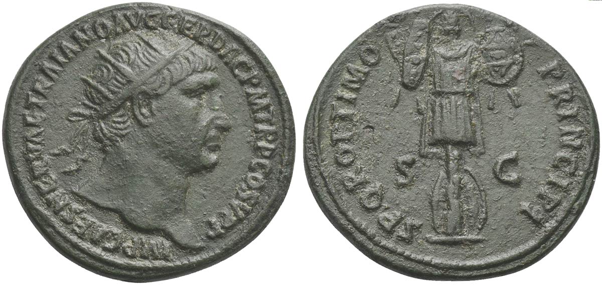 Trajan (98-117), Dupondius, Rome, ca. 103-7. AE (g 11,16; mm 28; h 5). IMP CAES NERVAE TRAIANO AVG GER DAC P M TR P COS V P P, Radiate head r., Rv. S P Q R OPTIMO PRINCIPI, Trophy with hexagonal and round shield at base. RIC 586. Near extremely fine