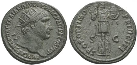 Trajan (98-117), Dupondius, Rome, ca. 103-7. AE (g 11,16; mm 28; h 5). IMP CAES NERVAE TRAIANO AVG GER DAC P M TR P COS V P P, Radiate head r., Rv. S P Q R OPTIMO PRINCIPI, Trophy with hexagonal and round shield at base. RIC 586. Near extremely fine