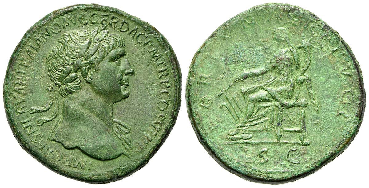Trajan (98-117), Sestertius, Rome, 112-4. AE (g 26,92; mm 34; h 6). IMP CAES NERVAE TRAIANO AVG GER DAC P M TR P COS VI P P, Laureate bust r., slight drapery; Rv. FORTUNAE REDVCI, Fortuna seated l., feet on footstool, holding rudd