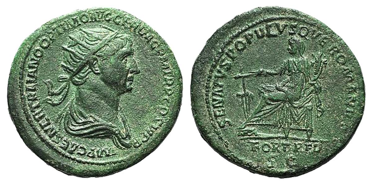 Trajan (98-117), Dupondius, Rome, 114-6. AE (g 14.09, mm 29, h 6). IMP CAES NER TRAIANO OPTIMO AVG GER DAC P M TR P COS III P P, Radiate and draped bust r.; Rv. SENATVS POPVLVSQVE ROMANVS / FORT RED / SC, Fortuna seated l., holdin