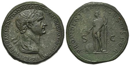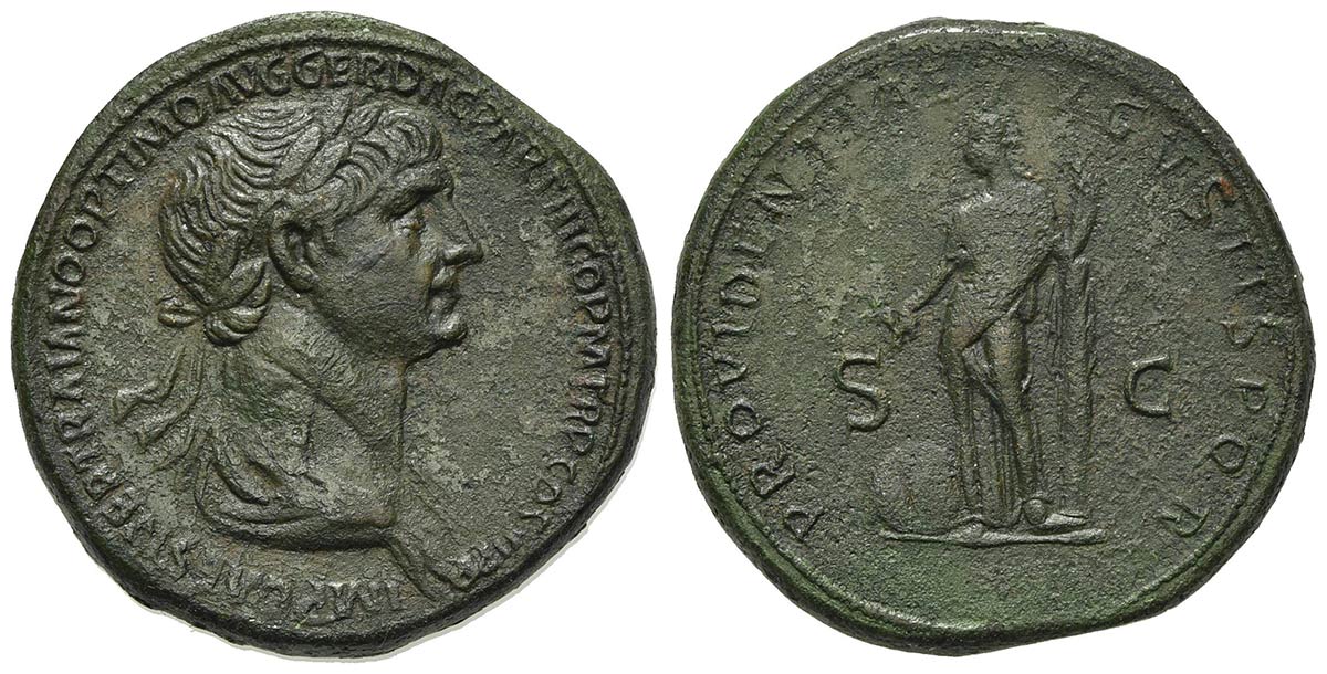 Trajan (98-117), Sestertius, Rome, 116-7. AE (g 28.18; mm 35; h 5). IMP CAES NER TRAIANO OPTIMO AVG GER DAC PARTHICO PM TR P COS VI PP, Laureate and draped bust r.; Rv. PROVIDENTIA AVGVSTI SPQR, Providentia standing l., holding sceptre and leaning on draped column, pointing to globe at feet to l., S - C. RIC 663. Smoothed, green patina, near very fine