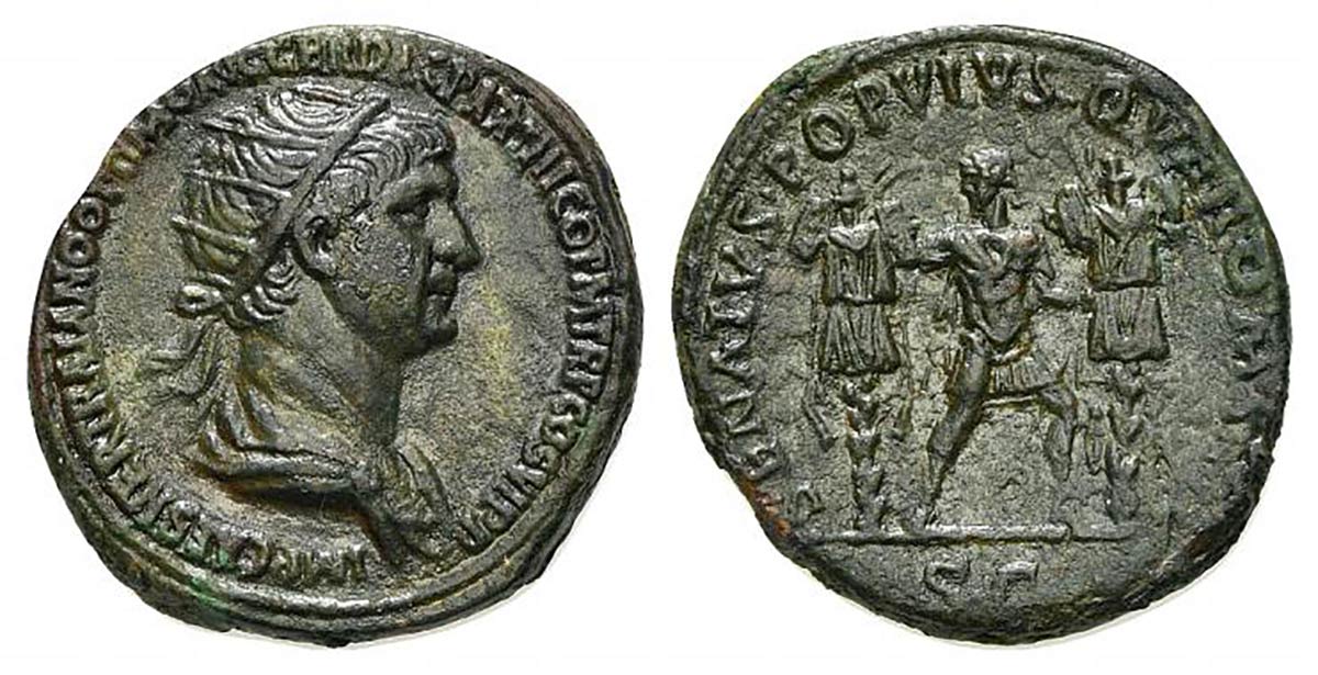 Trajan (98-117), Dupondius, Rome, 116-7. AE (g 11,63; mm 26,5; h 7). MP CAES NER TRAIANO OPTIMO AVG GER DAC PARTHICO P M TR P COS VI P P, Radiate and draped bust r.; Rv. SENATVS POPVLVSQVE ROMANVS, Trajan standing r., head l., holding spear; trophy to l. and r., S C. RIC 676. Good very fine