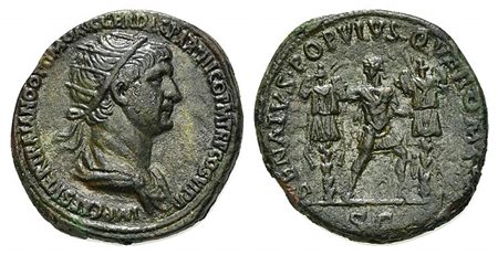 Trajan (98-117), Dupondius, Rome, 116-7. AE (g 11,63; mm 26,5; h 7). MP CAES NER TRAIANO OPTIMO AVG GER DAC PARTHICO P M TR P COS VI P P, Radiate and draped bust r.; Rv. SENATVS POPVLVSQVE ROMANVS, Trajan standing r., head l., holding spear; trophy to l. and r., S C. RIC 676. Good very fine