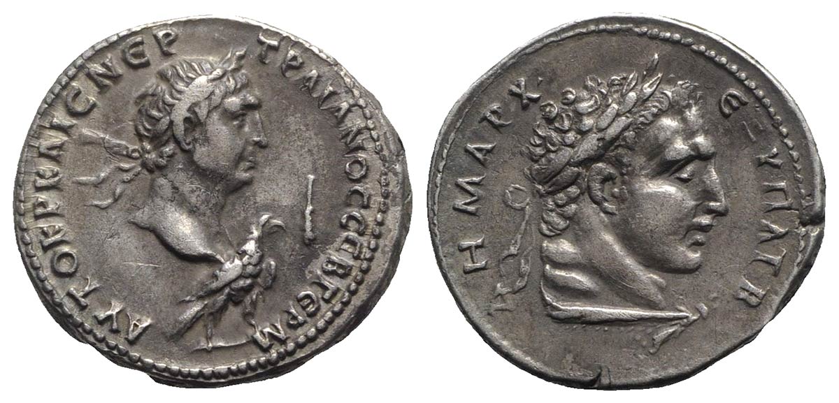 Trajan (98-117), Tetradrachm, Phoenicia, Tyre. AR (g 14,77; mm 27; h 6), year 2 (AD 98-9). AYTOKP KAIC NEP TRAIANOC CЄB ΓЄPM, Laureate head r., supported by eagle standing r.; palm behind, club before; Rv. ΔHMAPK ЄΞ YΠAT B, Laurea