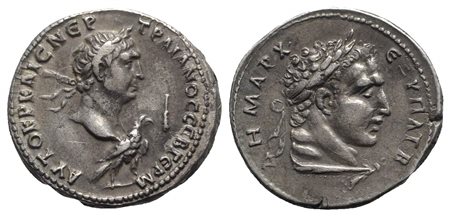 Trajan (98-117), Tetradrachm, Phoenicia, Tyre. AR (g 14,77; mm 27; h 6), year 2 (AD 98-9). AYTOKP KAIC NEP TRAIANOC CЄB ΓЄPM, Laureate head r., supported by eagle standing r.; palm behind, club before; Rv. ΔHMAPK ЄΞ YΠAT B, Laureate bust of Melkart-Herakles r., lion skin tied around neck. McAlee 450; Prieur 1477. Toned, near extremely fine