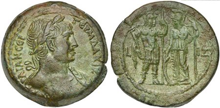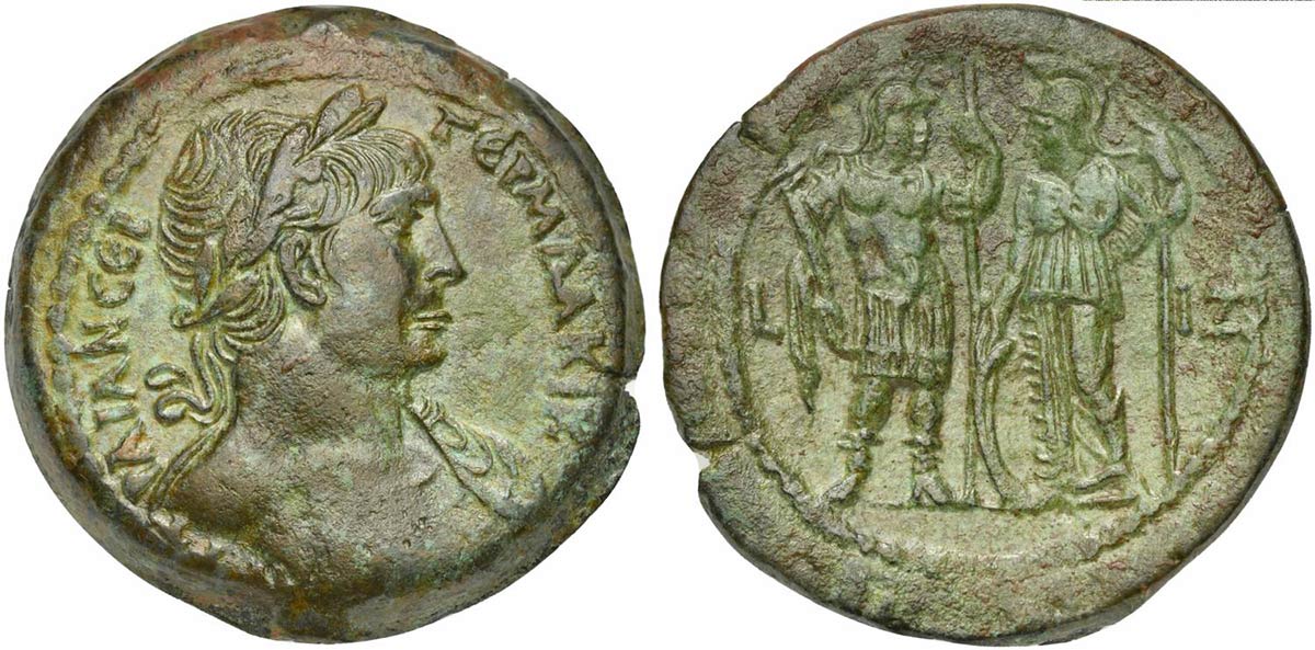 Trajan (98-117), Drachm, Egypt, Alexandria, AD 113-114. AE (g 24,12 ; mm 35 ; h 12). AVT T - PAIAN CЄB ΓЄPM ΔAKIK, laureate bust r., wearing aegis, Rv. Ares standing r., holding parazonium and spear facing Athena, standing l., hol