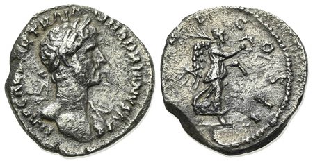 Hadrian (117-138), Quinarius, Rome, AD 118. AR (g 1.53; mm 14; h 6). IMP CAESAR TRAIAN HADRIANVS AVG, Laureate bust r., slight drapery; Rv. P M TR P COS II, Victory advancing r., holding palm frond and wreath. RIC 36a; RSC 1052. Rare, near very fine